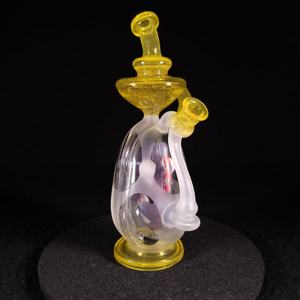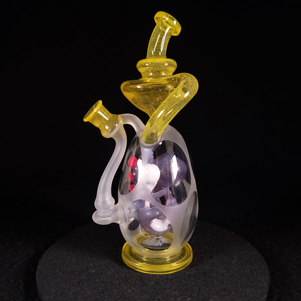 This Yoshi egg recycler features a translucent Yoshi with red spikes and signature white cheeks. The outside of the egg is sandblasted resem